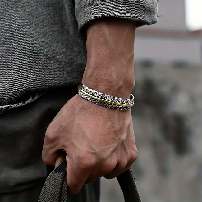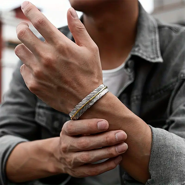 Вишуканий чоловічий браслет з візерунком пір'я – це стильний аксесуар, що підкреслить ваш індивідуальний стиль і додасть шарму до будь-якого образу. Легко поєднується з іншими прикрасами та підходить для щоденного носіння завдяки своєму зручному дизайну!