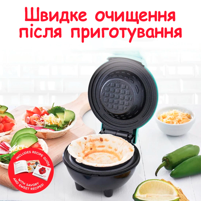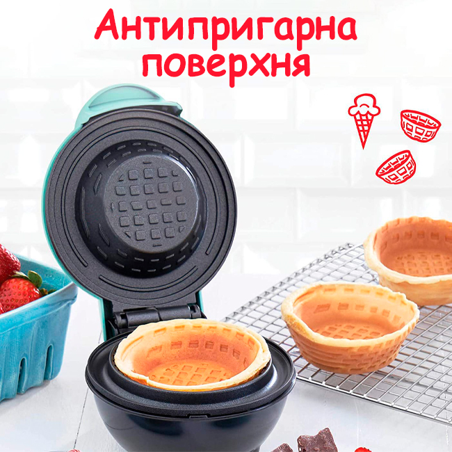 Особливості: Швидке приготування вафельних мисок, Антипригарна поверхня, Компактний розмір, Яскравий дизайн
