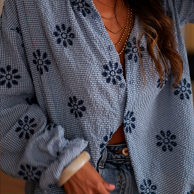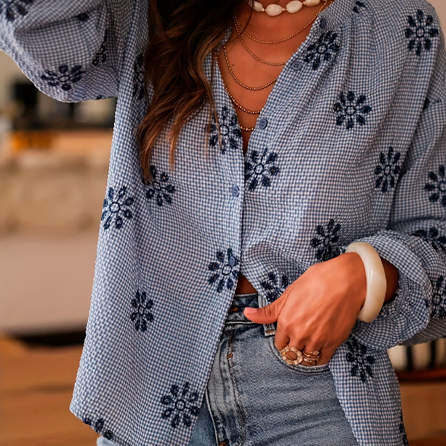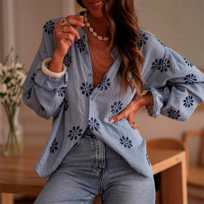 Стильна жіноча рубашка з коміром-стійкою та ґудзиками — ідеальний вибір для створення романтичного та жіночного образу. Ніжний квітковий візерунок у мінімалістичному стилі чудово підходить для щоденного носіння та особливих подій, особливо в теплу пору року. Вільний крій забезпечує комфорт протягом усього дня, не сковуючи рухів!